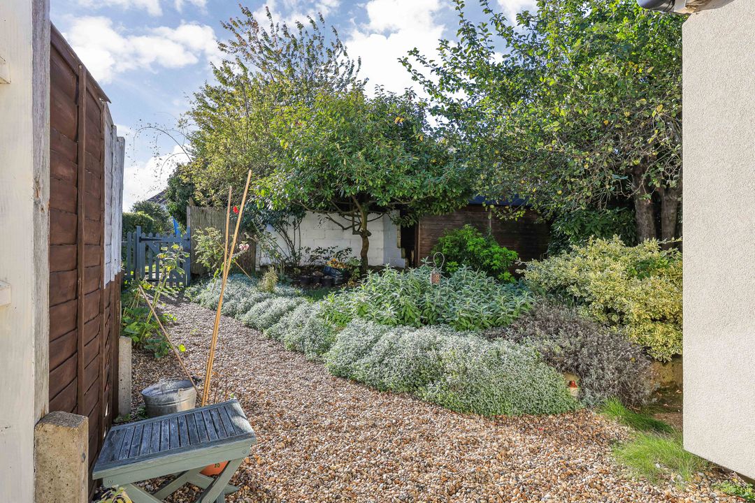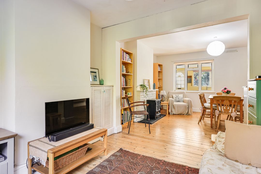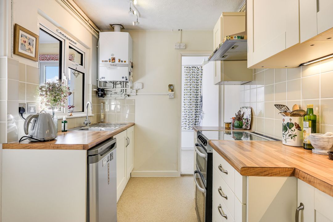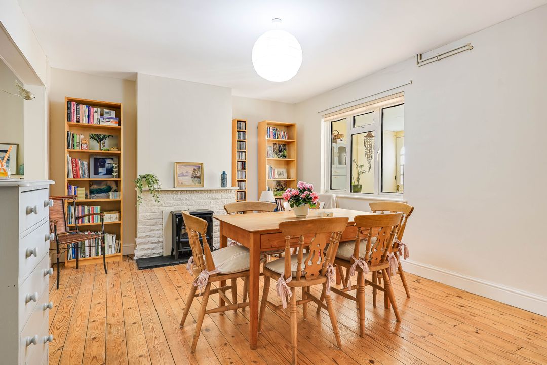 The ground floor comprises an entrance hall with the staircase rising to the first floor. The living room has exposed floorboards an open fireplace, and is dual aspect with the dining area extending through to the sitting room. The kitchen is fitted with an attractive range of cabinets set above and below the working surfaces. There is a single sink unit with mixer tap and drainer, a four-ring gas hob with extractor over, a double oven, and space for a fridge-freezer. A wall-mounted gas-fired central heating boiler provides the heating and hot water. Just off the kitchen is a useful garden room with a back door, and space and plumbing for a washing machine and tumble dryer. Beyond the kitchen, to the rear, is the family bathroom.