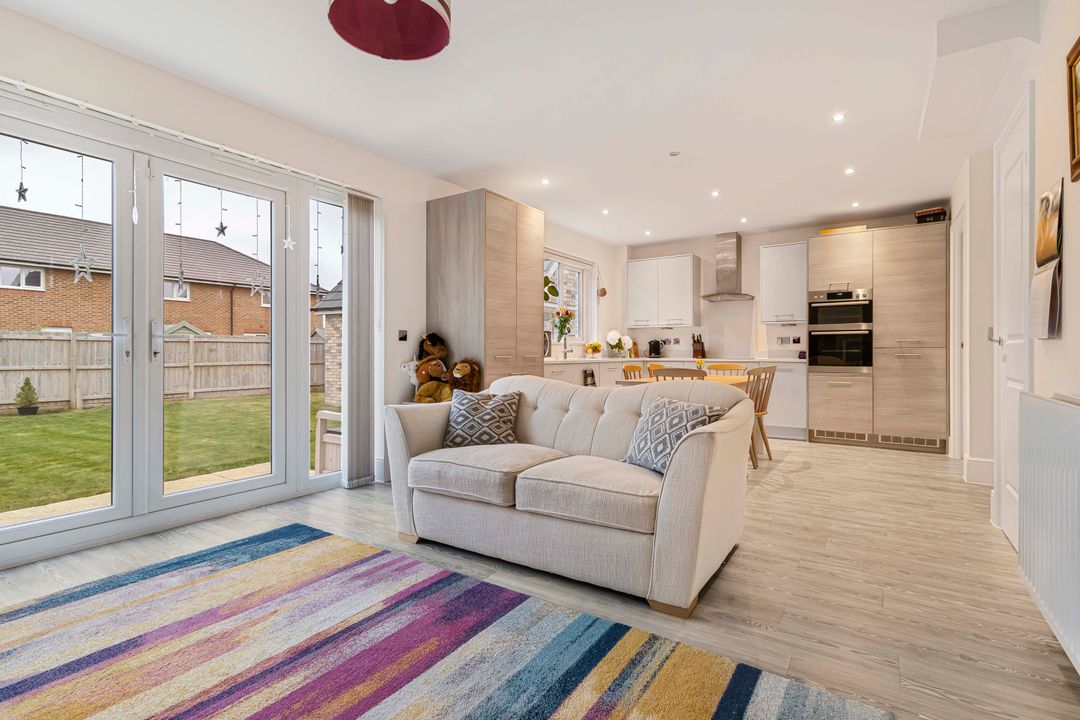 The ground floor opens to a welcoming entrance hall with a convenient cloakroom and useful storage. To the front is a bright bay-fronted living room, providing a comfortable and inviting space to relax. The heart of the home is the impressive open-plan kitchen, dining and family room stretching across the rear of the property. This superb space features sleek fitted units, integrated appliances and generous dining and seating areas, with French doors opening directly onto the rear garden, creating an ideal setting for entertaining or family life. A separate utility room provides additional storage and space for laundry appliances, keeping the main living areas neat and organised.