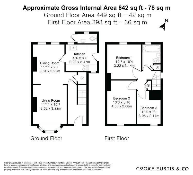 The property offers 842 sq ft (78 sq m) of well-arranged living accommodation across two floors. The ground floor features a bright living room with a bay window, a spacious dining room, and a modern fitted kitchen overlooking the rear garden. Upstairs, there are three well-proportioned bedrooms and a stylish family bathroom.
