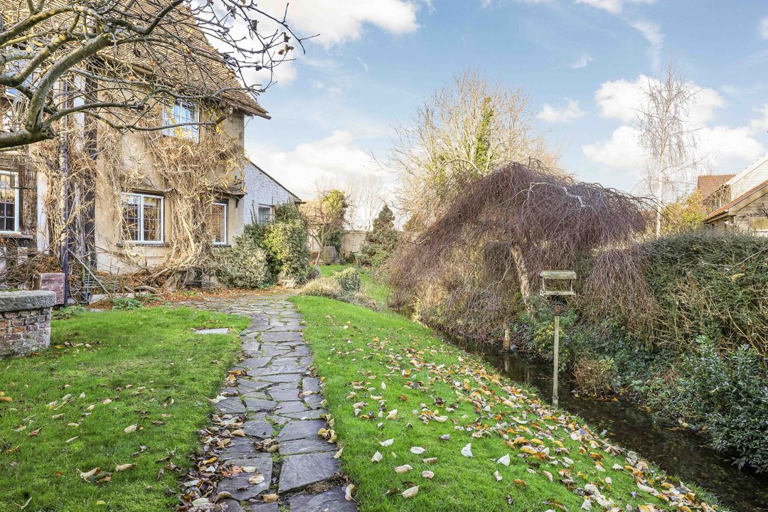 Set behind a high hedge that screens the property from the road, the house is approached over a paved path that follows a small watercourse and winds its way to the back door.