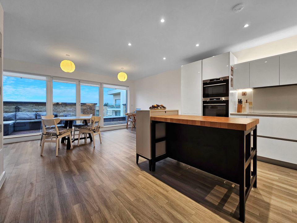 The top floor offers a contemporary open-plan living area filled with natural light thanks to its dual aspect, creating an ideal space for entertaining family and friends. The kitchen is well-appointed with high-quality base and wall-mounted units, ample work surfaces, and integrated appliances, including a fridge/freezer, electric oven, microwave oven, washing machine, and dishwasher. Double doors lead out to the terrace, providing unobstructed views and an excellent area for relaxation and alfresco dining.