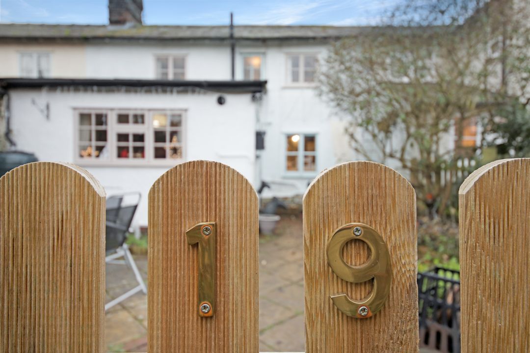 The cottage is positioned along a path leading from the High Street and sits among a row of period cottages. Gated access leads into the paved front garden which features raised flower and shrub beds and is enclosed by traditional picket fencing and mature hedgerows.