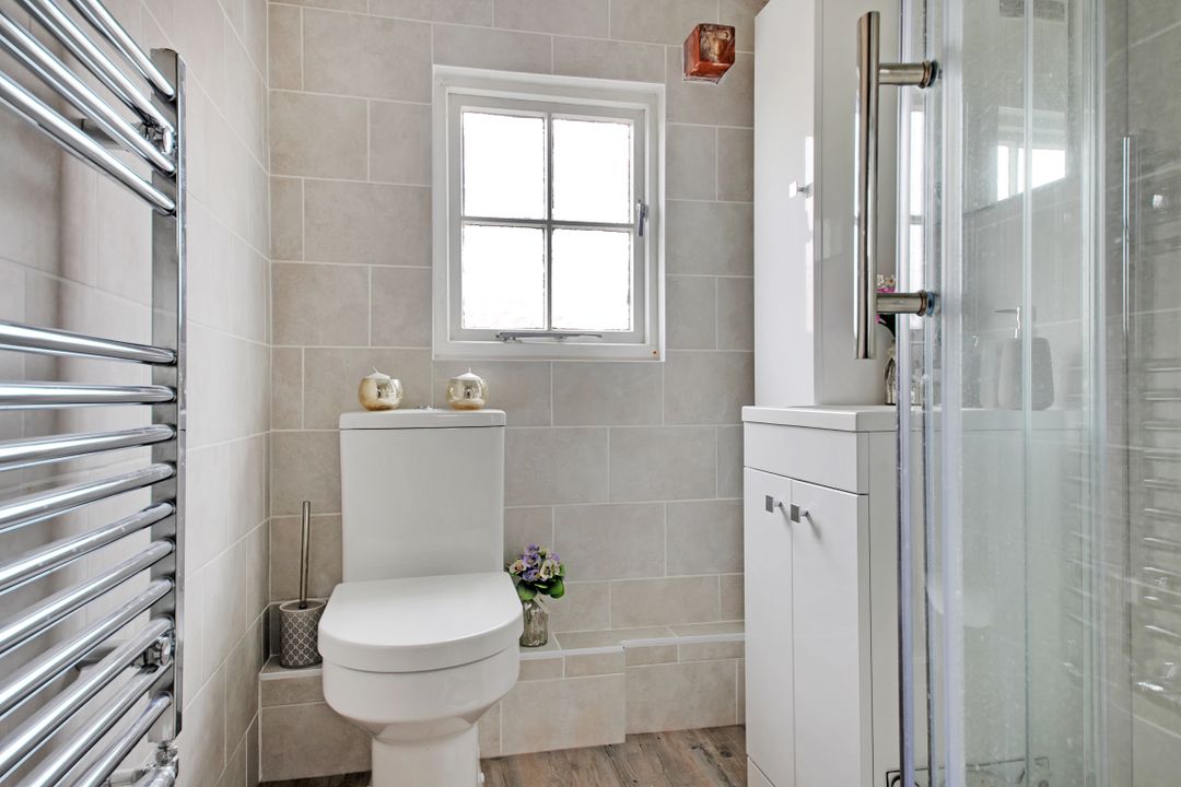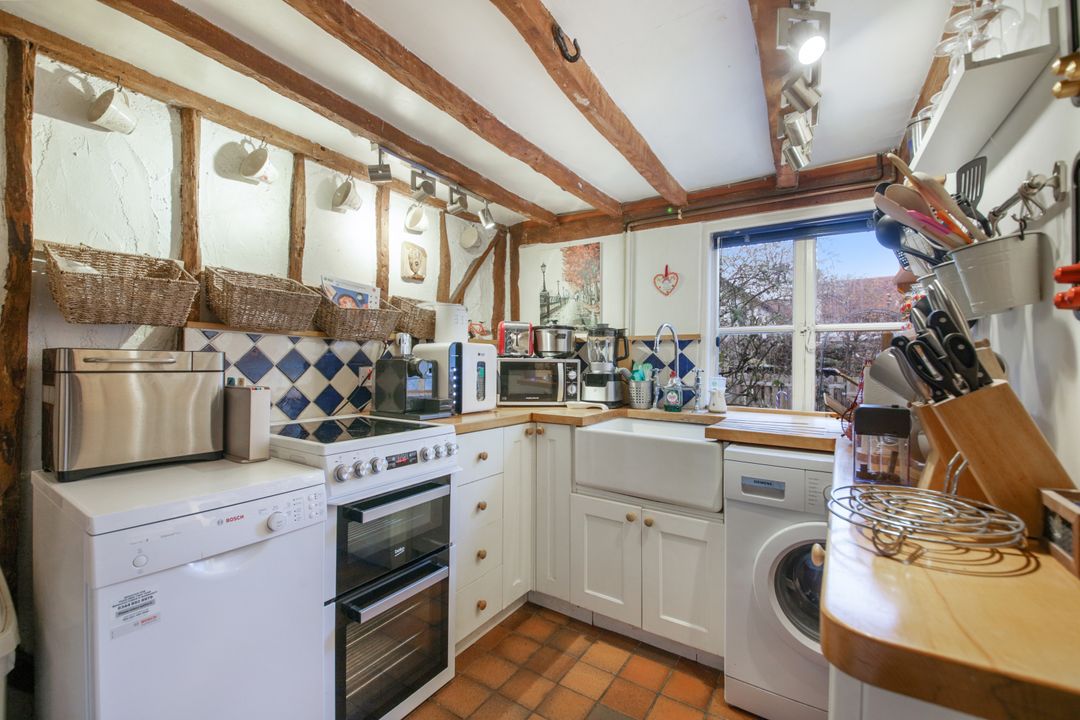 The kitchen makes very good use of the space and has traditional styled units and storage with a Butler sink set within a wooden work surface. There is space for an oven and a fridge freezer and plumbing for a washing machine & dishwasher. From here, stairs lead to the first floor, with bespoke storage cupboards fitted underneath matching the kitchen units and making full use of the space.