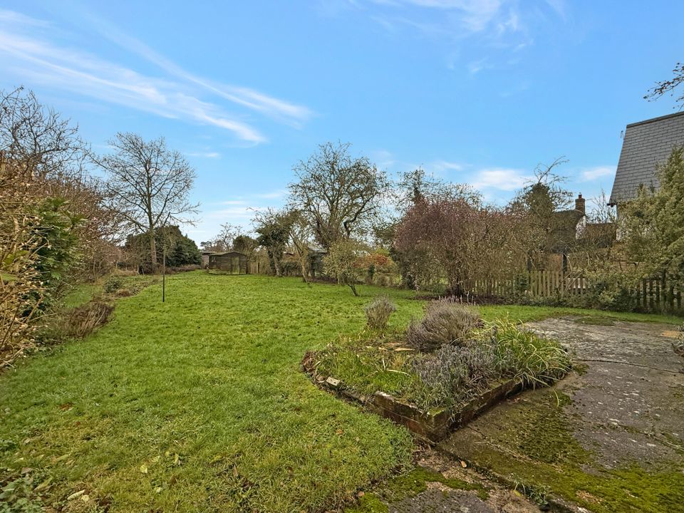 The rear garden is predominantly laid to lawn with a patio area adjoining the house, complemented by a further selection of plants, shrubs and trees, along with a timber shed.