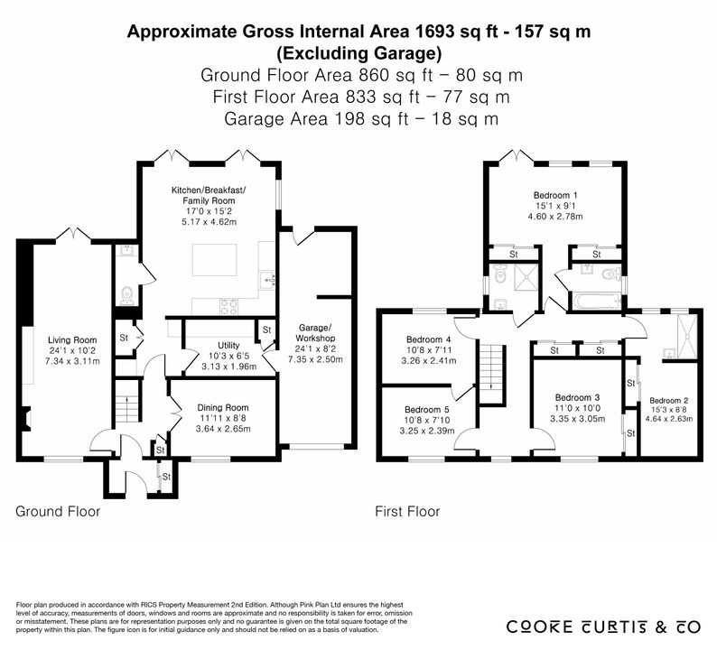 The first floor offers five well-proportioned bedrooms, providing excellent flexibility for families, guests or home working. The principal bedroom overlooks the rear garden and is a particularly generous space with plenty of natural light, a Juliet balcony, built-in wardrobes and en-suite bathroom. A second bedroom with built-in wardrobe and en-suite shower room offers flexibility for guests and older children. A third bedroom with built-in wardrobe and two further double bedrooms are well proportioned and thoughtfully laid out, served by a modern family bathroom fitted with a contemporary suite. Additional storage is positioned off the landing and within the bedroom areas, providing excellent space for linens, clothing and everyday essentials.
