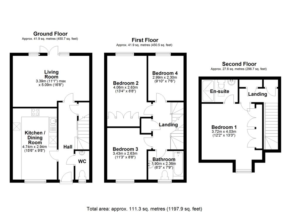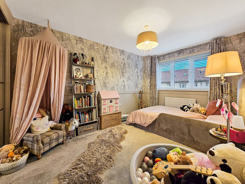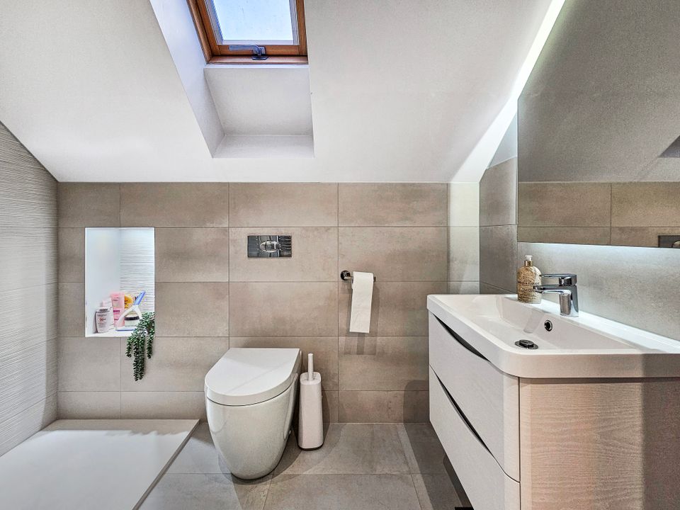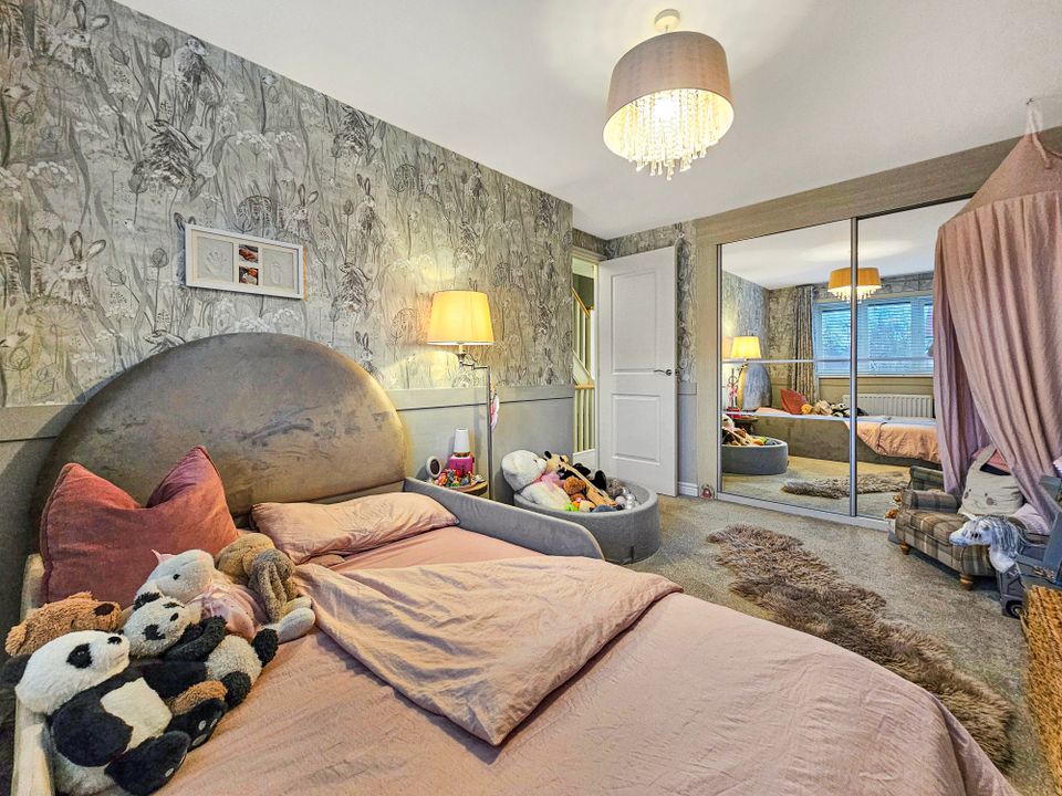 The first floor offers three well-proportioned bedrooms, with bedroom two benefiting from fitted wardrobes. The family bathroom is finished to a high standard and comprises a contemporary white three-piece suite, complemented by attractive tiling and a heated towel rail.
