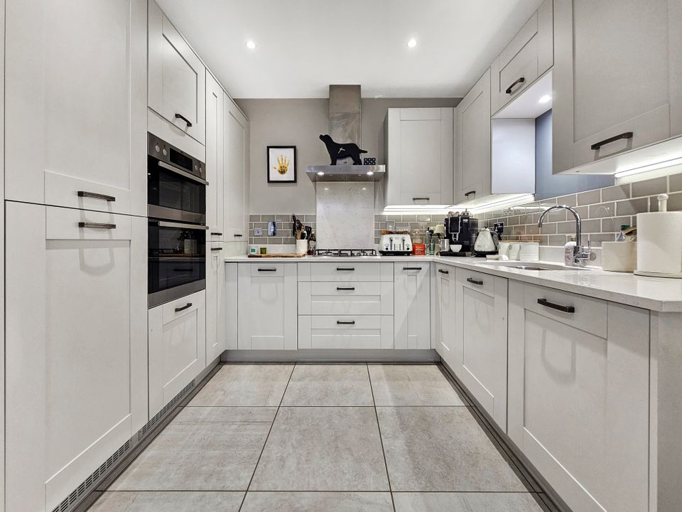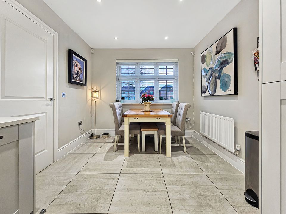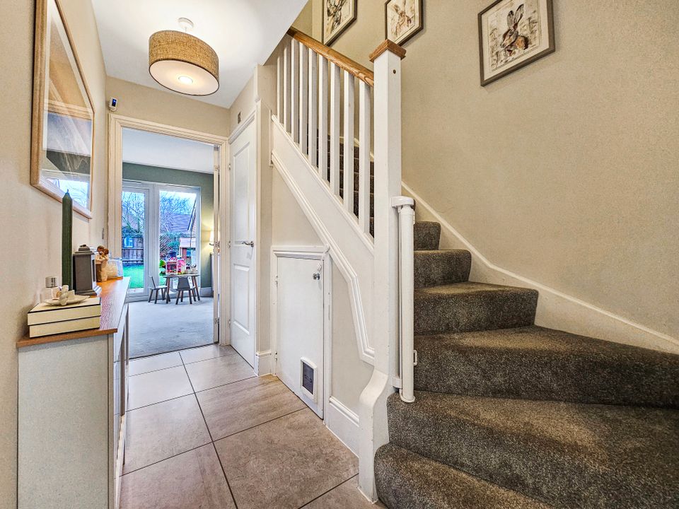 The property is approached via a neatly maintained front garden, with a canopy over the front door. Upon entering, a welcoming entrance hall provides access to the staircase leading to the first floor. To the front of the property is a well-appointed and modern kitchen/dining room, fitted with a comprehensive range of high-quality wall and base units and integrated appliances, including a fridge/freezer, dishwasher, microwave, oven, and gas hob with extractor above.