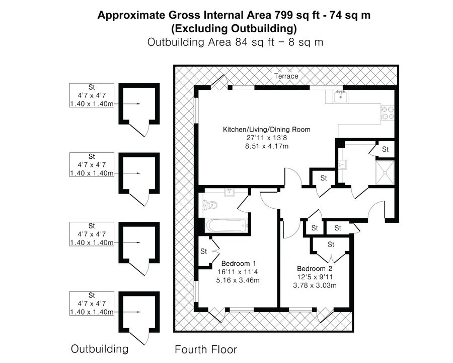 There are two good-sized double bedrooms, including a particularly spacious principal bedroom with ensuite, along with a well-appointed bathroom. Storage is excellent throughout, with multiple internal cupboards plus the added benefit of four separate storage cupboards within the development. Notably, two storage cupboards are currently rented out, offering useful additional income potential.