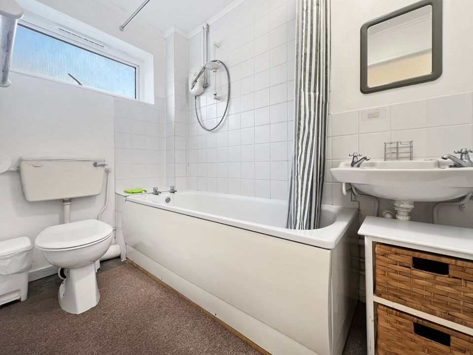 The double bedroom is generously proportioned and benefits from a large window, making it a comfortable and airy retreat with space for wardrobes and additional furnishings. The bathroom is fitted with a white suite comprising a panelled bath with shower over, wash hand basin and WC, with tiled walls and an obscured window for ventilation and privacy.