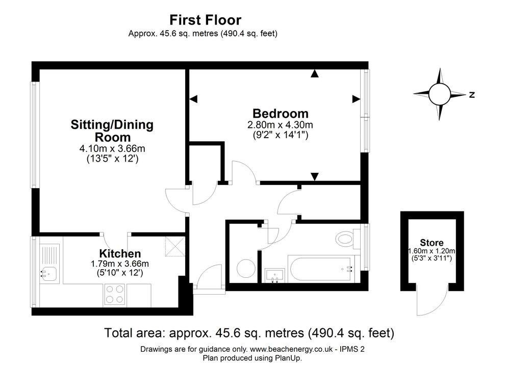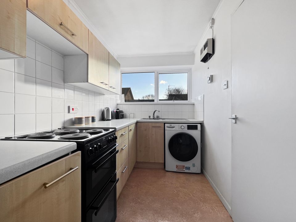 Accessed via a private entrance at ground level, stairs lead up to a central hallway which provides access to all rooms. The sitting and dining room is a good-sized, bright space with a large window overlooking the communal green, providing ample room for both living and dining furniture. The adjacent kitchen is fitted with a range of matching units and work surfaces, with space and plumbing for appliances, and a window bringing in plenty of natural light.