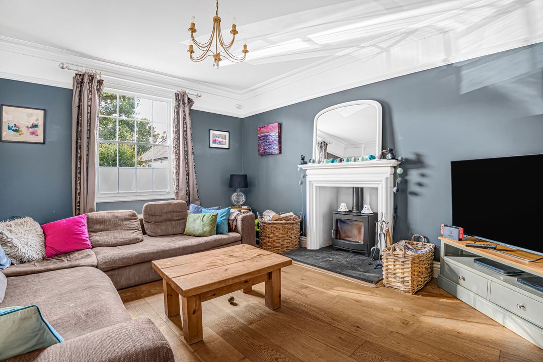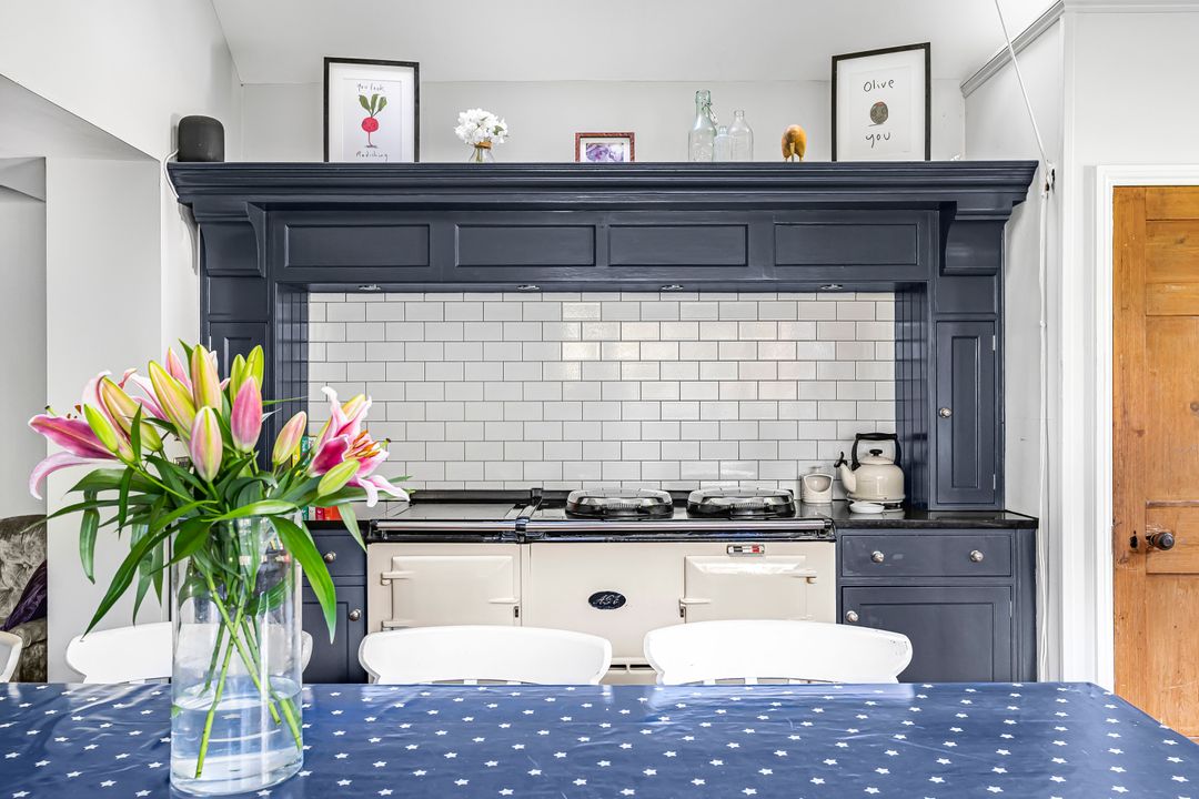 Upon entering through the porch, which offers space for coats and shoes, you’ll find an impressively extended open-plan kitchen/dining/family room, perfect for entertaining family and friends. This light-filled space boasts a triple aspect and Velux windows, while a stable door leads to the rear garden, complemented by a stylish tiled floor. The kitchen is comprehensively equipped with a range of wall and base-mounted units, generous work surfaces, an inset sink with a stainless steel mixer tap, an electric hob, and an Aga, along with space for additional appliances, including an American-style fridge freezer.