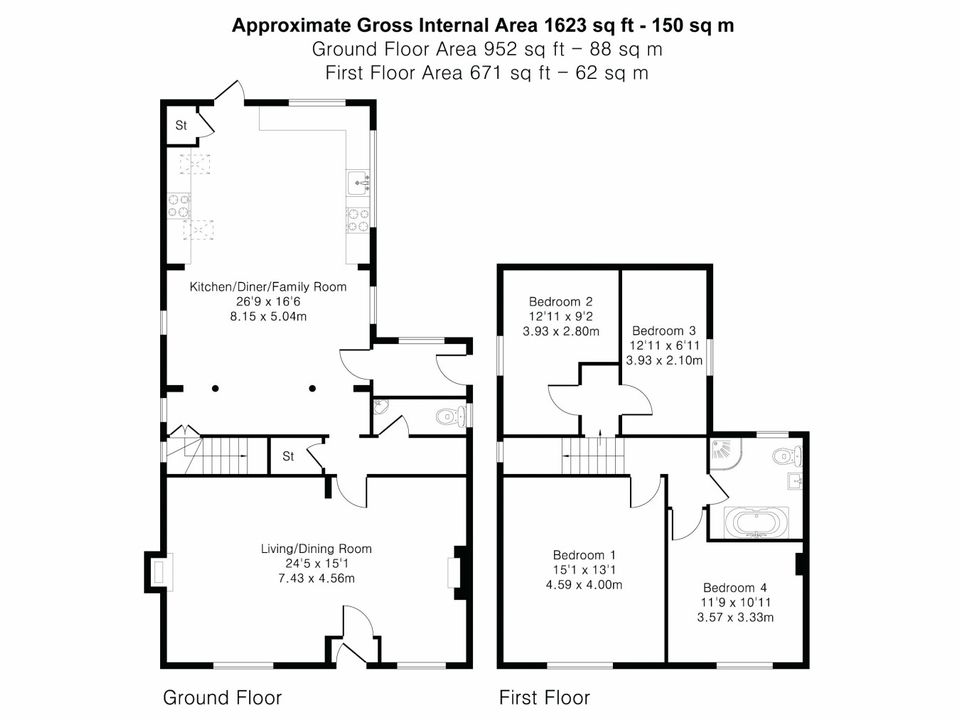 Upstairs, you'll find four spacious bedrooms and a family bathroom. The bathroom features a modern white suite, including a roll-top bath and a separate walk-in shower, beautifully finished with stylish half-wall panelling.
