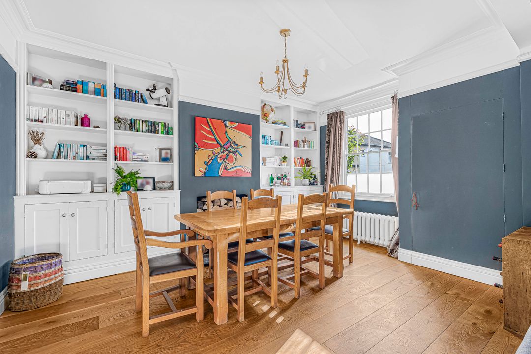 The expansive living/dining room spans the width of the original house, measuring over 24'5" x 15'1" (1.43m x 4.56m). It features wood flooring, built-in shelving, and cupboards flanking a charming feature fireplace, while a wood burner creates a cozy focal point with its slate hearth. A convenient downstairs w/c completes the ground floor accommodation.