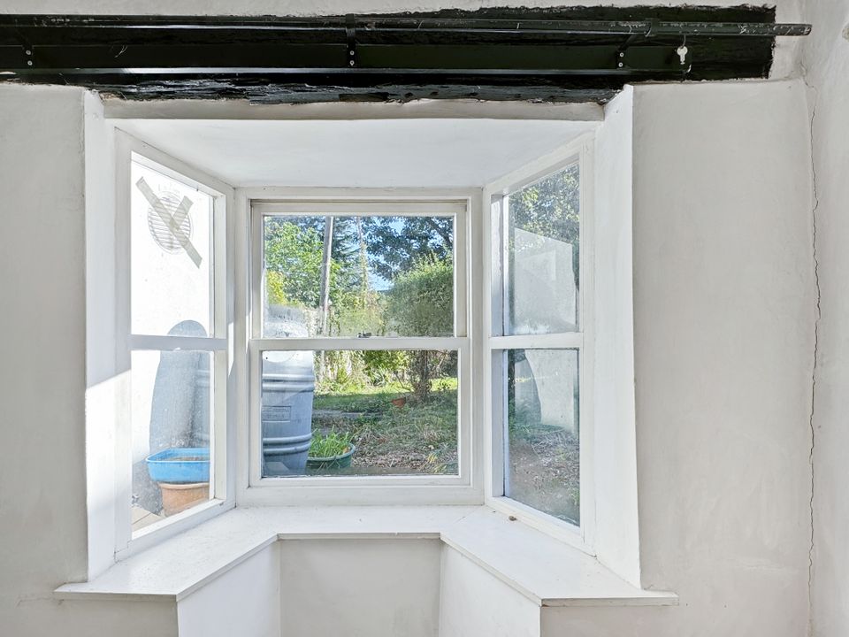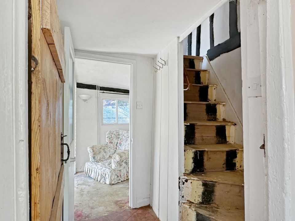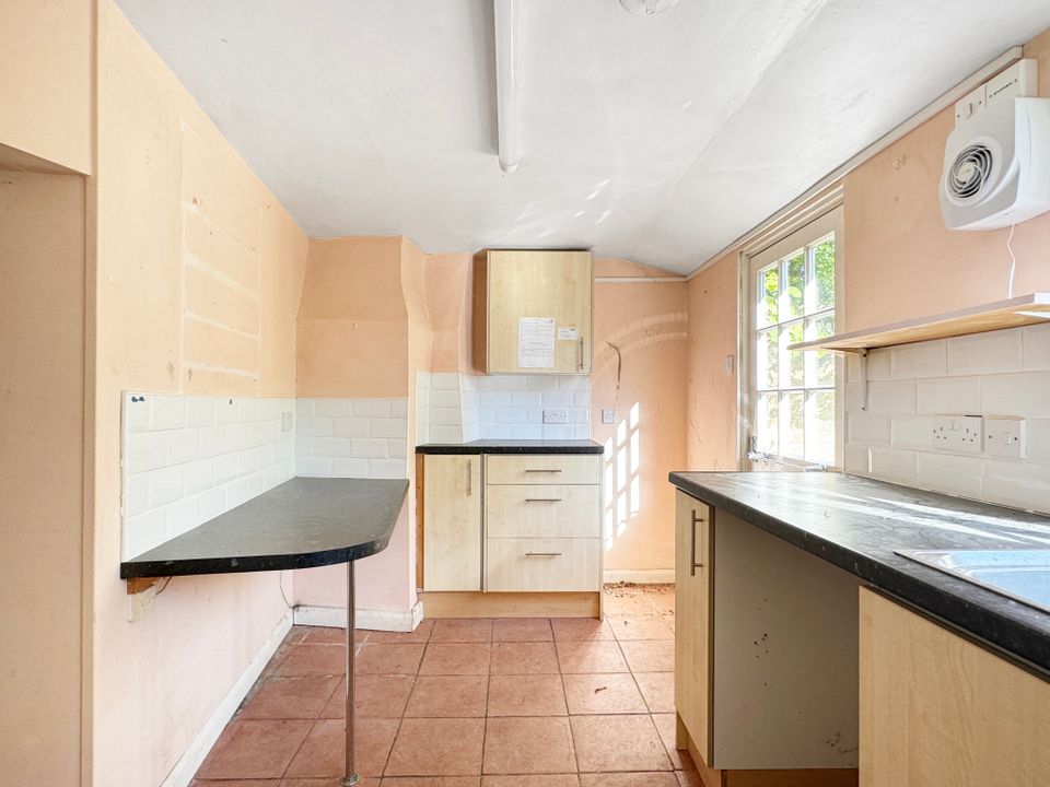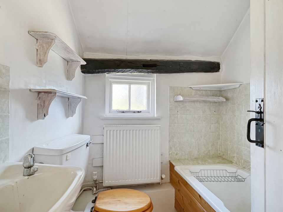 To the front of the property, is a bright triple aspect living room with a bay window overlooking the rear garden and a cupboard that extends under the staircase. The room enjoys lots of natural light and there are exposed timbers and a fireplace. An inner hallway with a staircase to the first floor leads through to the kitchen, which is to the rear of the property and has cupboards above and below the working surfaces. There is space for a washing machine, a fridge and a cooker with an extractor over. A door gives access to the rear garden.
