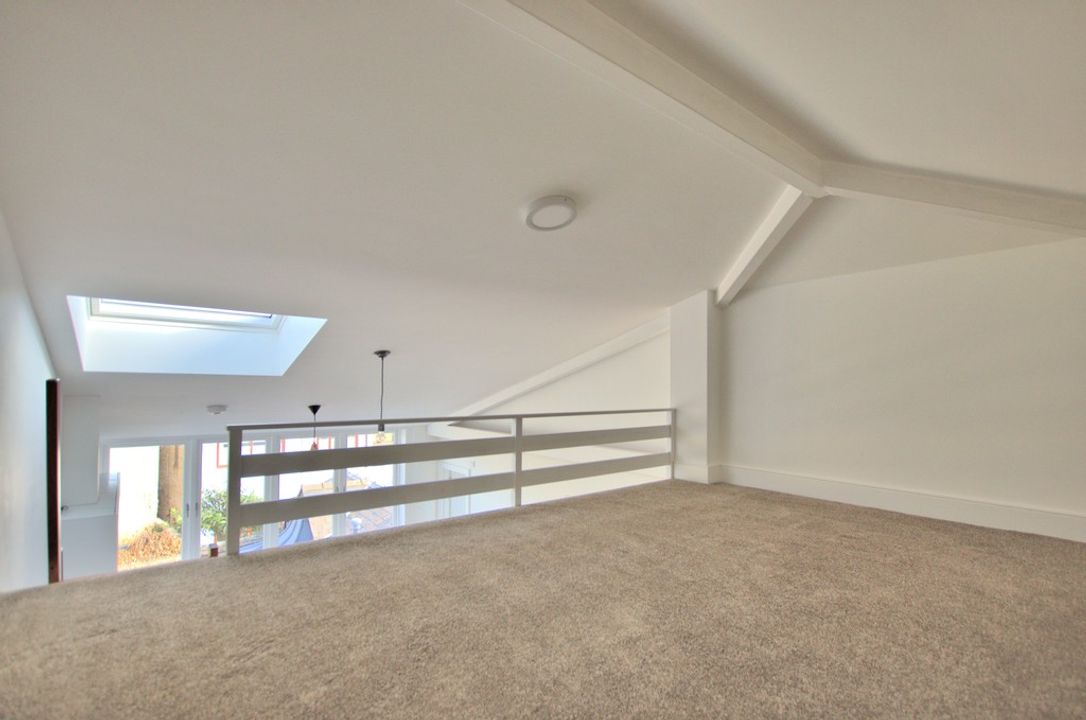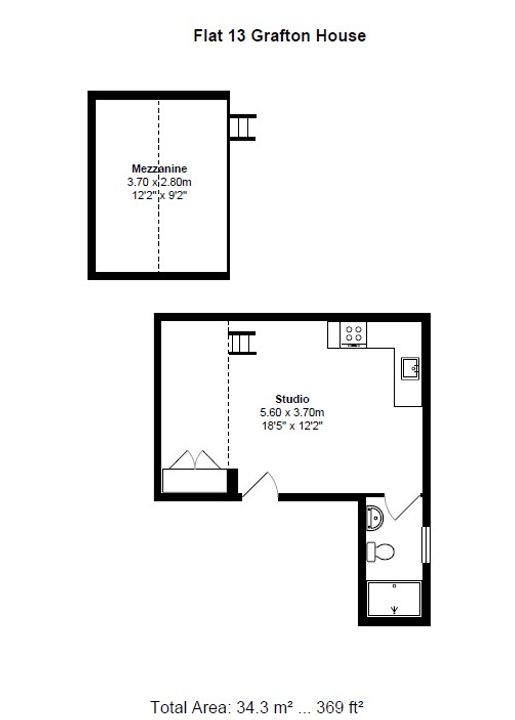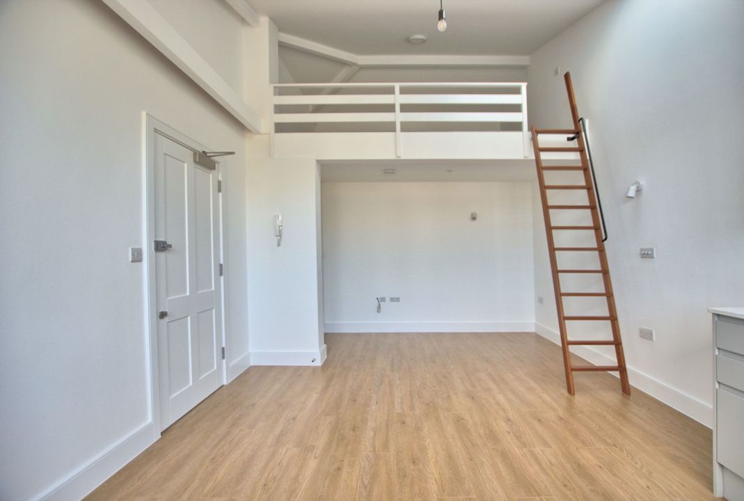 The main living space of the apartment is technically a studio, but the high ceilings allow for a mezzanine over part of the room meaning spaces can be separated if required. The mezzanine is accessed via a ladder and it benefits from carpet.