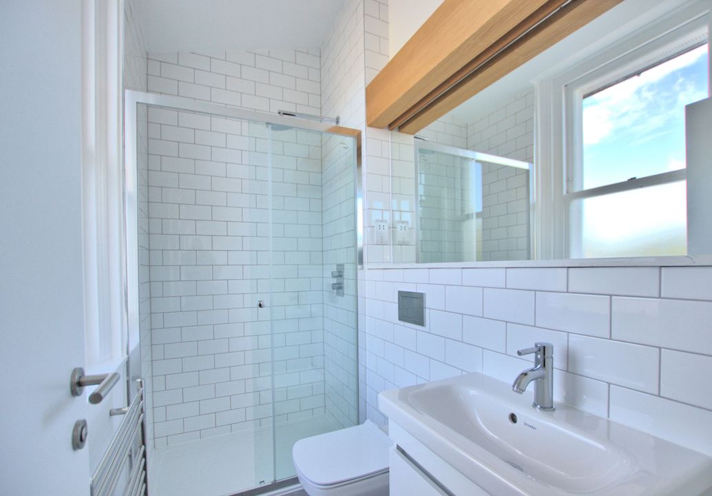 The apartment itself benefits from a large window looking over the front of the plot. This means it is incredibly light. The kitchen is equipped with an electric hob, oven, washer / dryer and undercounter fridge with freezer compartment. A bathroom off to the side comprises a walk-in shower with glass screen, WC and basin. It is mostly tiled with a large mirror and a frosted-glass window.