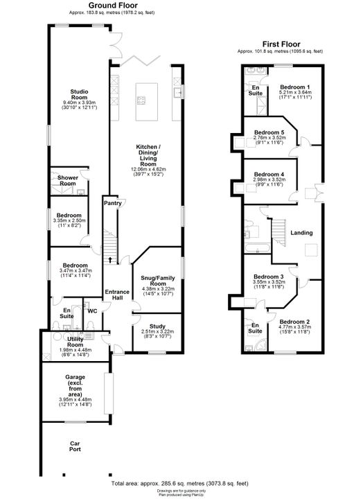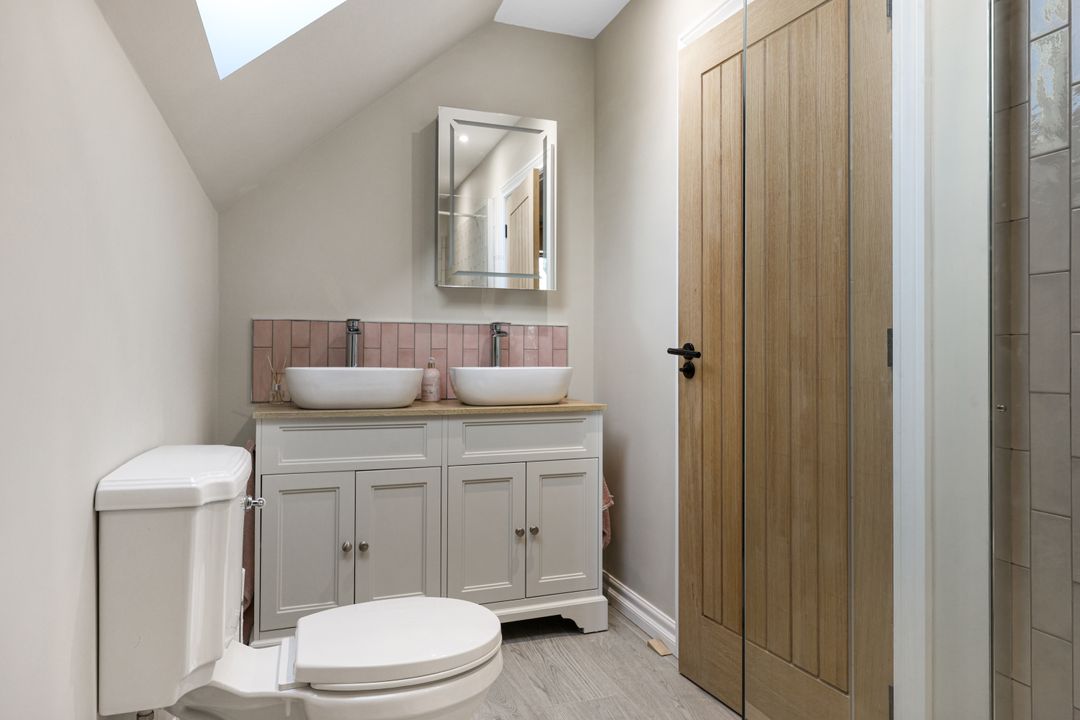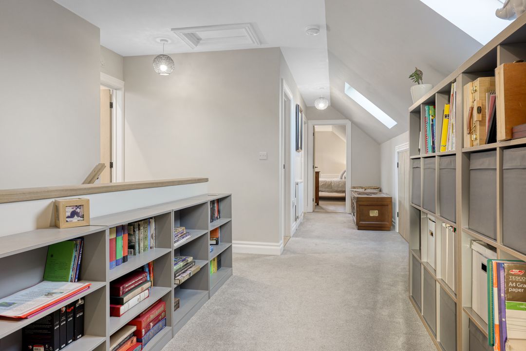 A generous landing creates an airy space suitable for a study or library area. The home boasts five well-proportioned bedrooms, including a luxurious principal suite overlooking the garden, complete with a stylish four-piece en-suite featuring a walk-in shower, twin basins, and a low-level WC. Bedrooms two and three share a Jack & Jill en-suite shower room, while the remaining two bedrooms are served by a centrally located family bathroom with a contemporary three-piece suite.