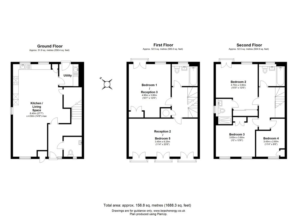 The house is characterised by the tall glazing in the main rooms, making it particularly light and spacious feeling. The ground floor provides a superb kitchen / dining / living space, plus a utility room and cloakroom. On the first floor are two generous rooms plus a bathroom. Either of these rooms could happily be a living room or bedroom. The top floor has three bedrooms, an en-suite and bathroom.